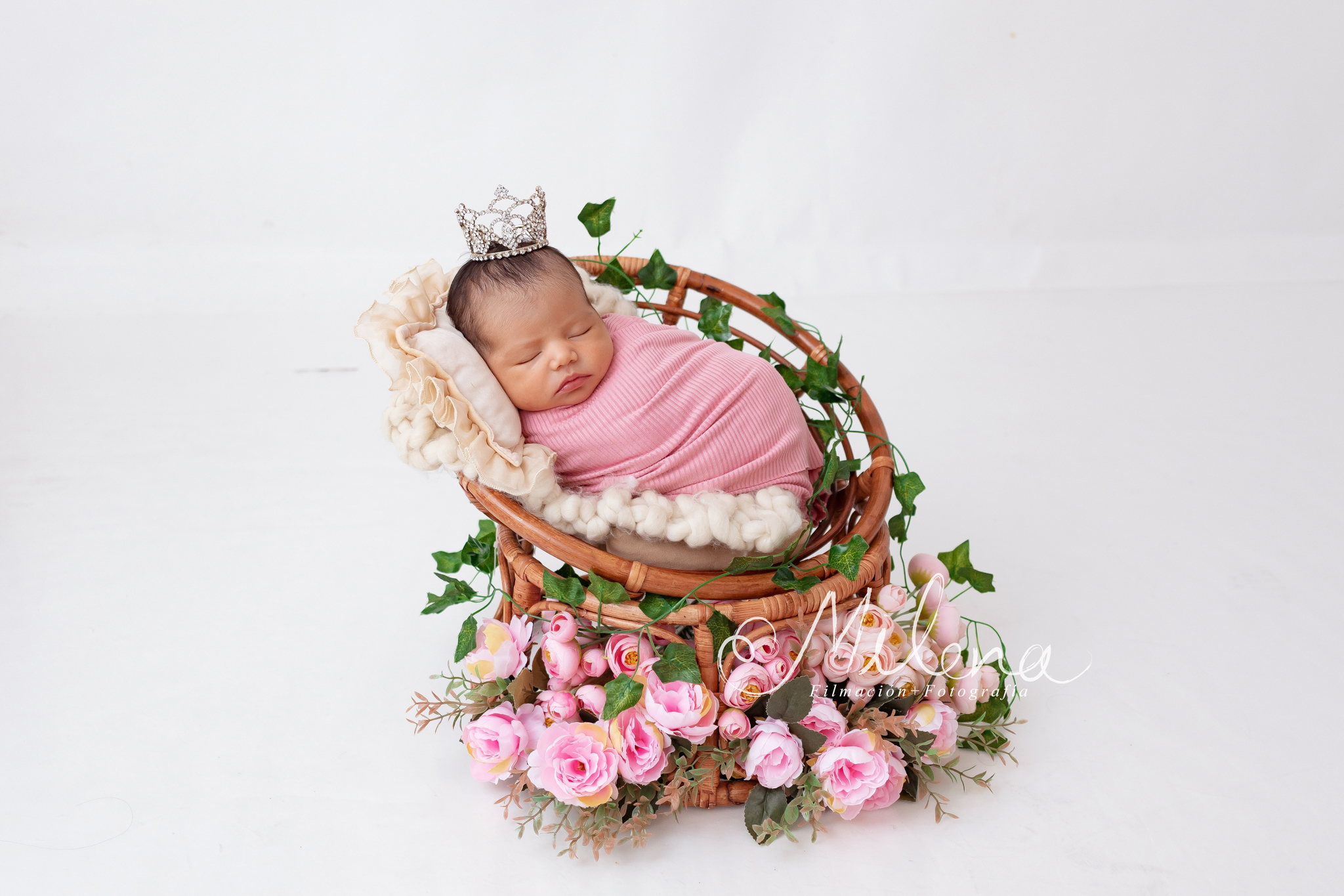 1. La bebé durmiendo plácidamente en una sillita de mimbre, con de flores rosa.
