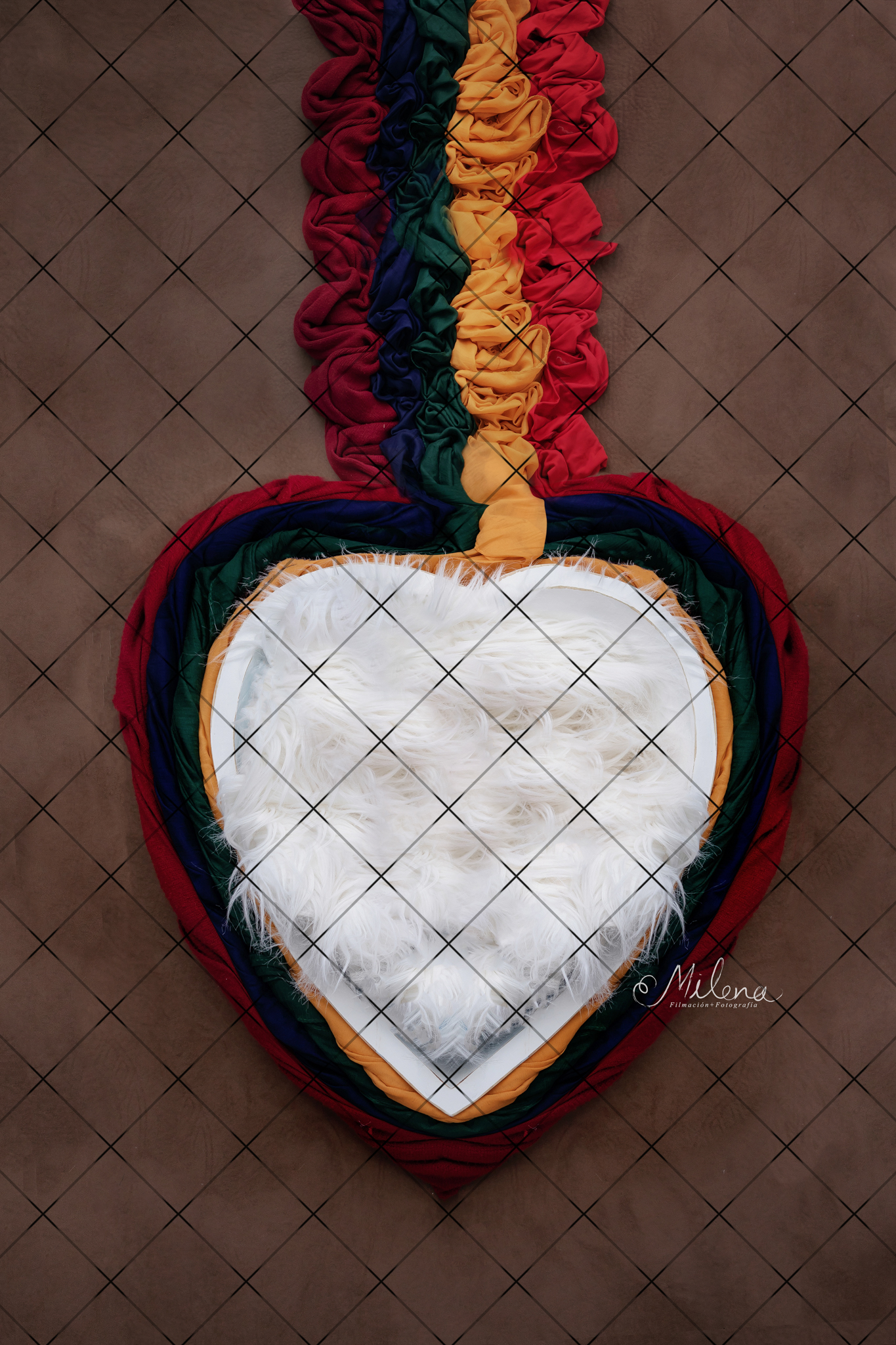 Para ello, utilizamos un contenedor de madera en forma de corazón como base, el cual decoramos con una suave estela de telas en tonos cafés, desde el beige más claro hasta el marrón chocolate más intenso. También agregamos algunos detalles en color blanco para darle un toque de luminosidad y frescura al conjunto. Inicialmente la foto la tomaos sin los elementos del arcoíris ya que editaríamos y agregaríamos el fondo de manera digital.