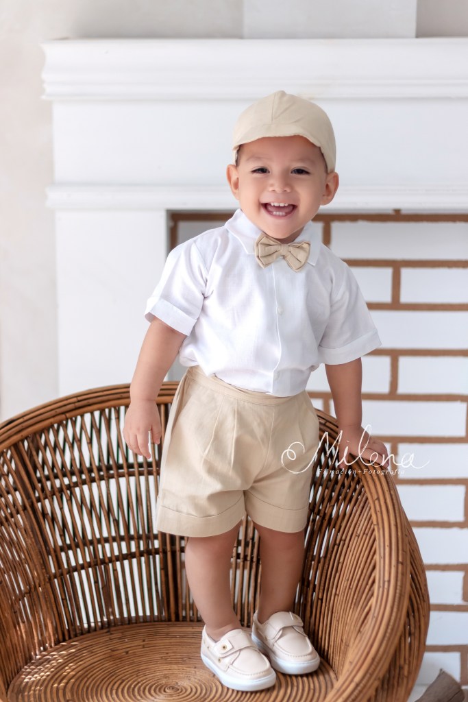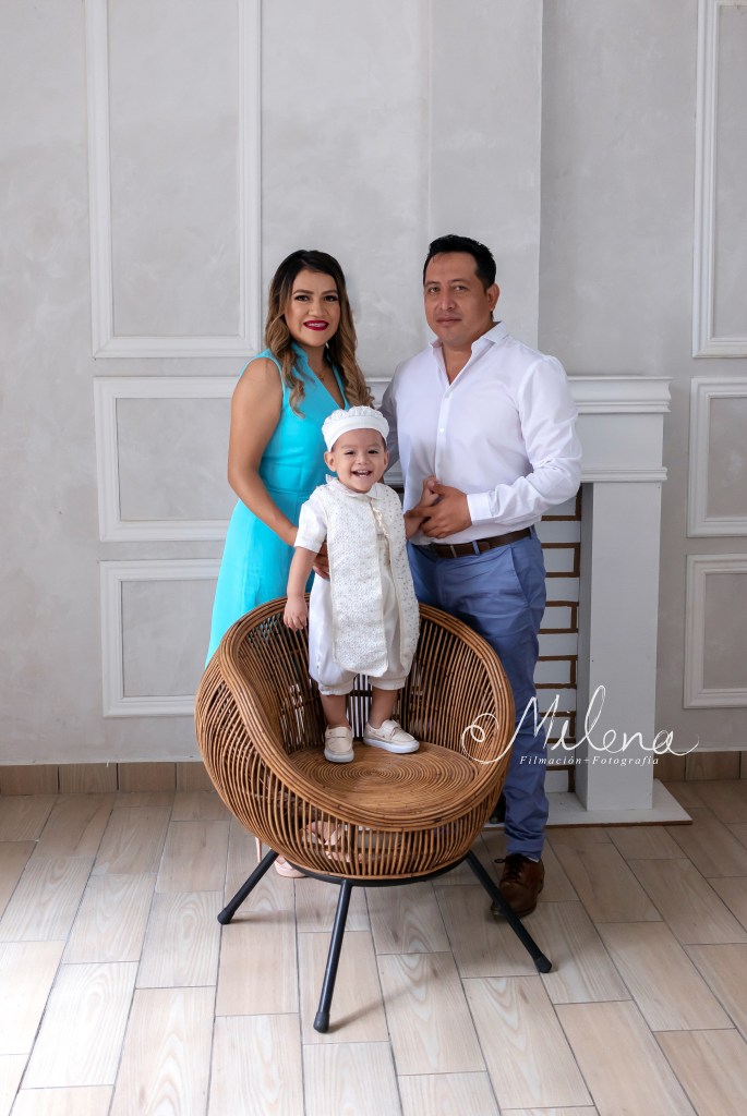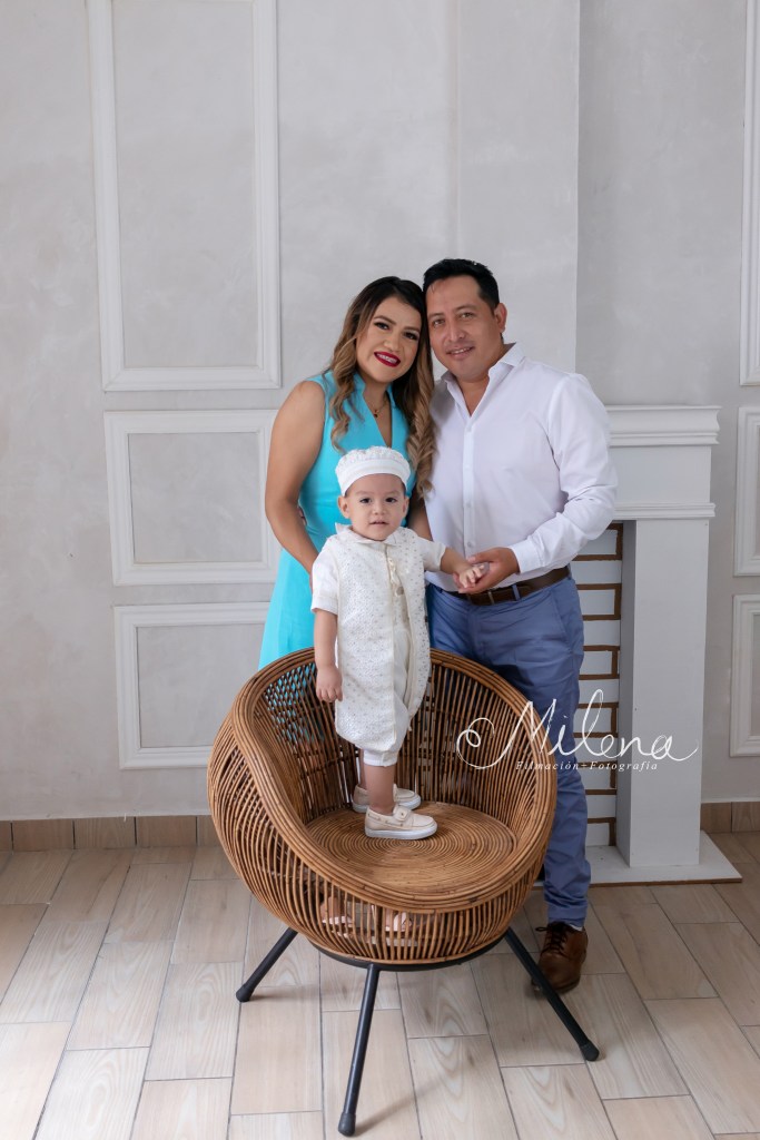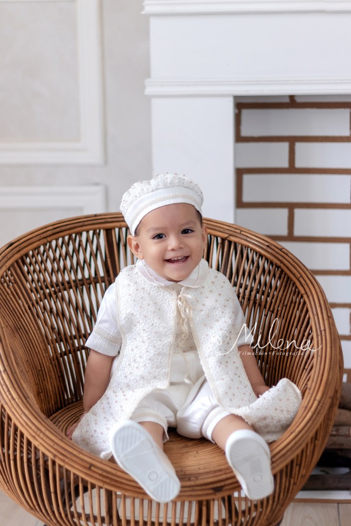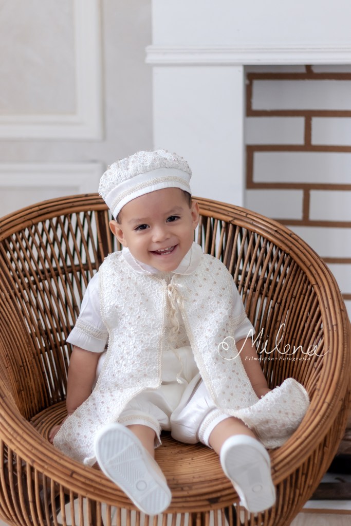 El ropón de bebé y su conjunto para usar en la fiesta es espectacular, le queda increíble y destaca sus rasgos faciales. Usamos ambos atuendos para tomarle fotos con mamá y papá, y a él solo. ¿No les encanta la sonrisa tan sincera y llena de vida de bebé?