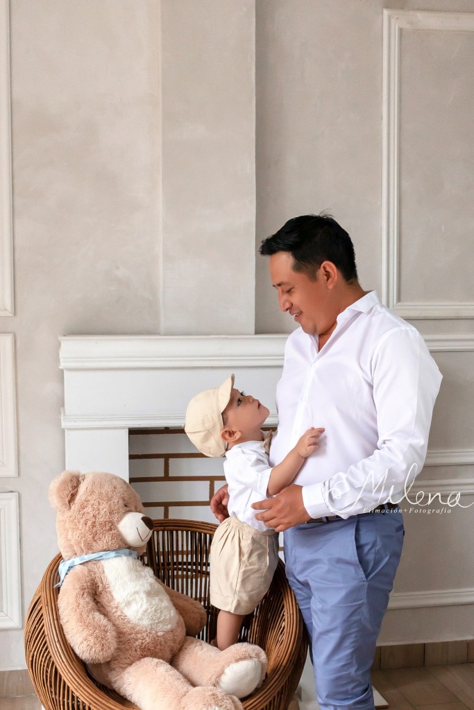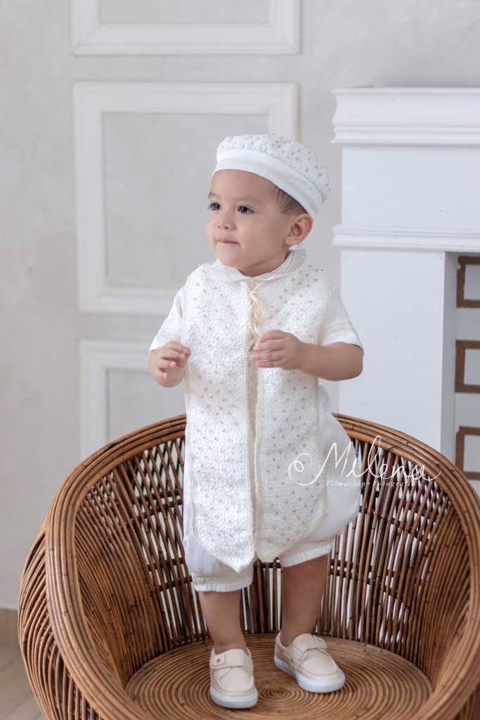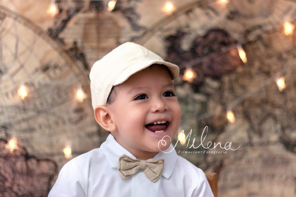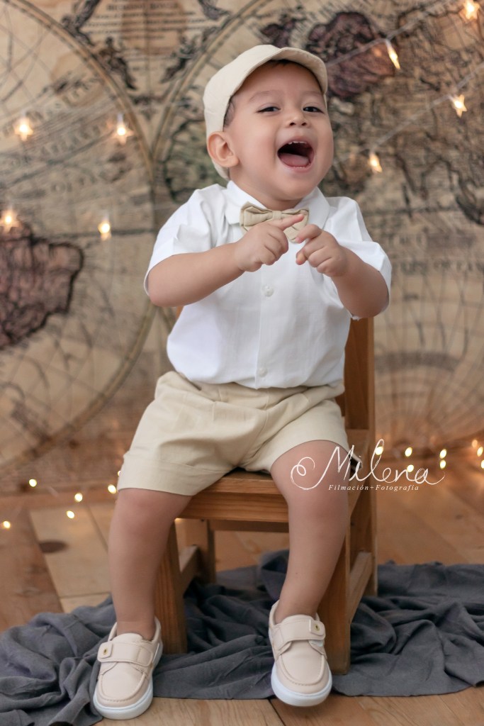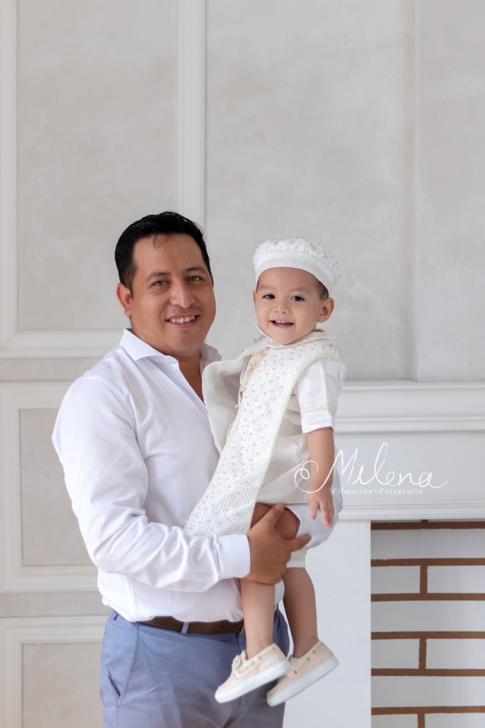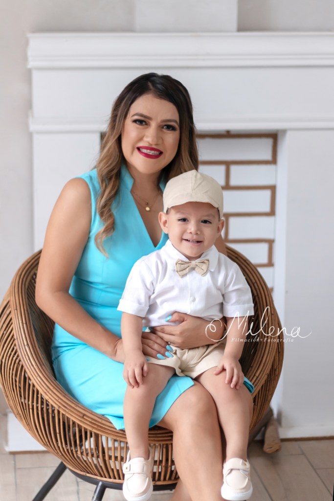 El ropón de bebé y su conjunto para usar en la fiesta es espectacular, le queda increíble y destaca sus rasgos faciales. Usamos ambos atuendos para tomarle fotos con mamá y papá, y a él solo. ¿No les encanta la sonrisa tan sincera y llena de vida de bebé?